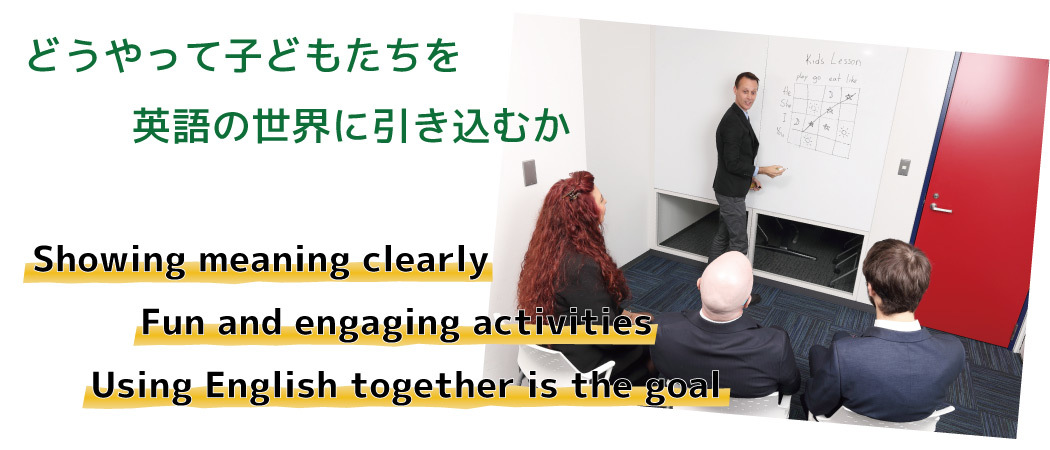 着任前に56時間におよぶ研修では特に、子どもたちにどうやって英語の世界に引き込むか、全て英語のレッスンでどうやって説明するか、いろいろと例を示しながら、英語学習者がわかりやすい指導法を身につけることを目指します。